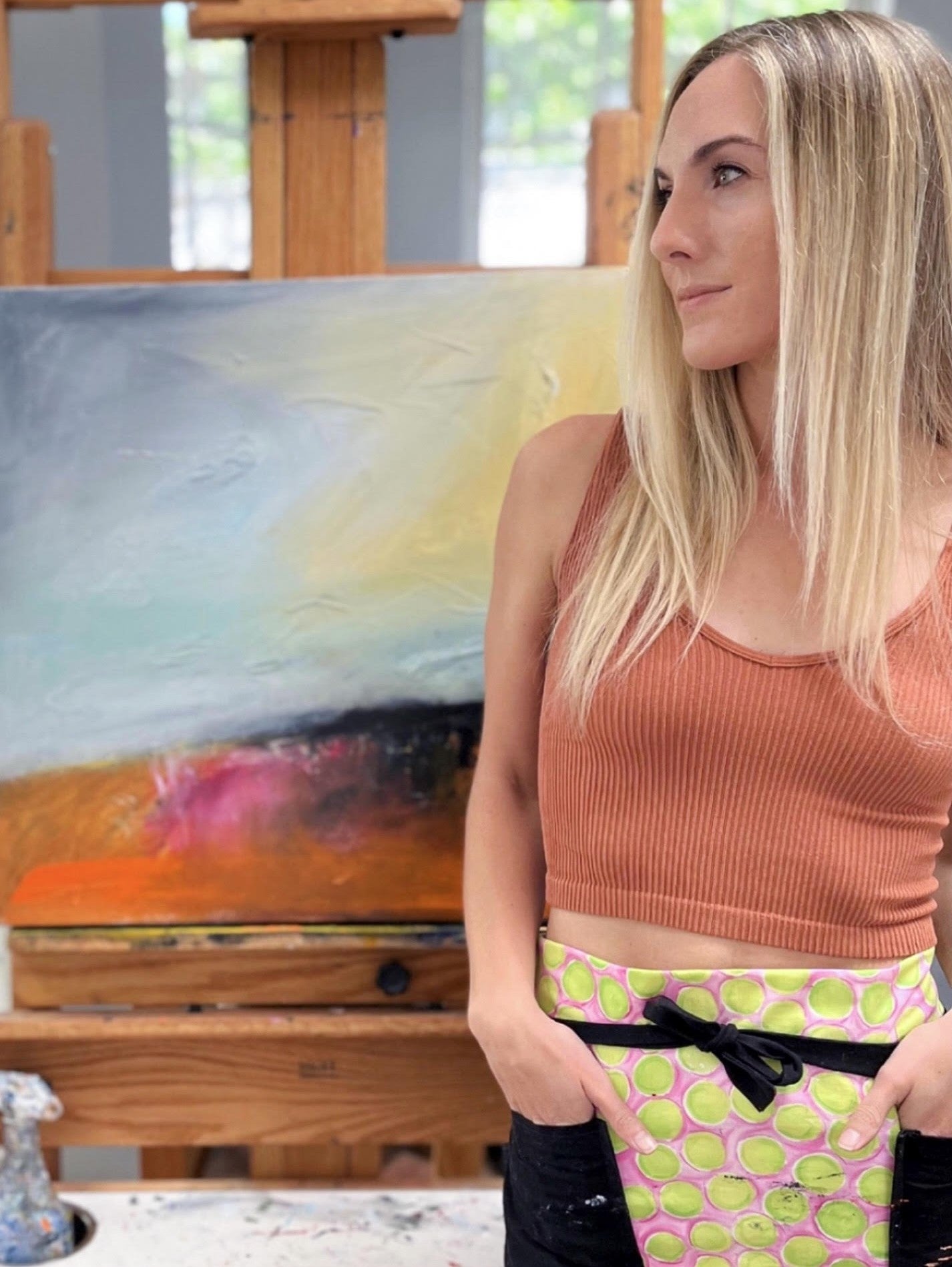 Kasey Burgunder is a contemporary artist whose work ranges from large abstract landscapes to miniature paintings for her jewelry. Coming from a modern dance background, she enjoys incorporating a sense of movement and storytelling to her pieces.
